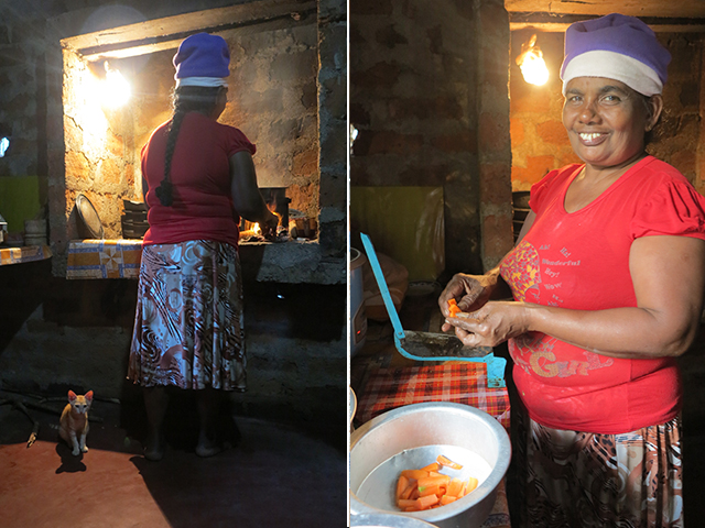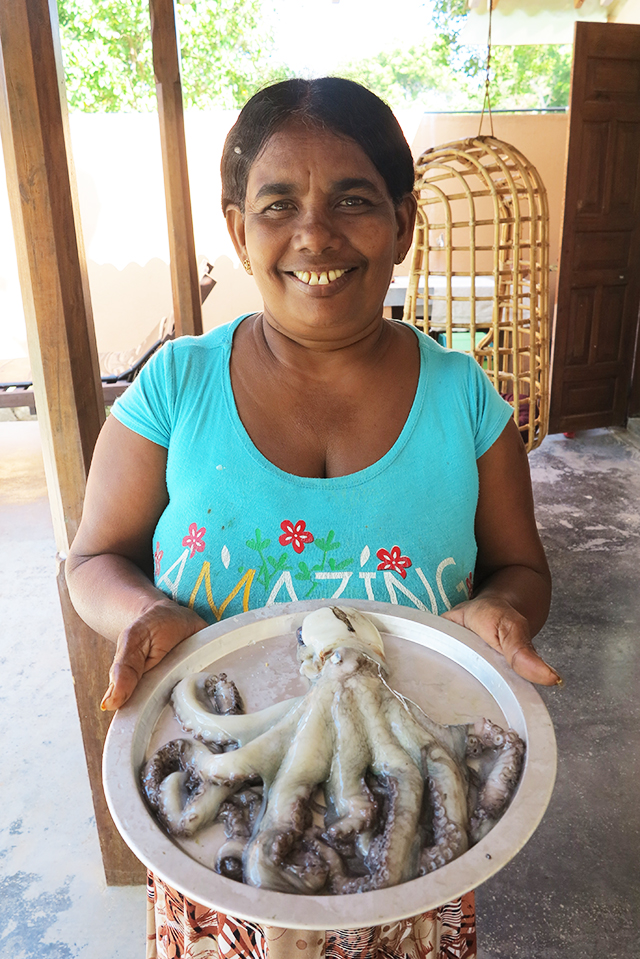 Anti kako smo je prekrstili, nam je uglavnom pravila riblji kari, dal, plavi patlidžan, papadam (što je testo prženo u ulju), krompir sa ljutom paprikom, salate… Ovo je ribarsko selo i ne jedu piletinu ni drugo meso. Jedan dan sam ih zamolila da dođem kod njih i gledam kako kuva. Kada sam došla, sve namirnice su već bile spremne. Poslužile su me čajem i bombonama. Anti je vešto ćuteći kuvala, sa deda mraz kapom na glavi kao pravi šef i budističkim mirom. Malika mi je pričala sve što jednu dvadesetogodišnju devojku može da zanima, pokazivala mi je svoje haljine i slike iz foto albuma, o tome kako su preživeli cunami, o ostalim članovima porodice, šire i uže familije.